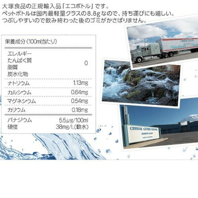 【クリスタルガイザー シャスタ産正規輸入品エコボトルの原材料】水(湧水)【栄養成分】(100mL当たり)エネルギー・・・0kcaLたんぱく質・・・0g脂質・・・0g炭水化物・・・0gナトリウム・・・1.13mgカルシウム・・・0.64mgマグネシウム・・・0.54mgカリウム・・・0.18mgバナジウム・・・ 5.5μg 硬度・・・38mg/L【保存方法】・高温、直射日光をさけて保存してください。